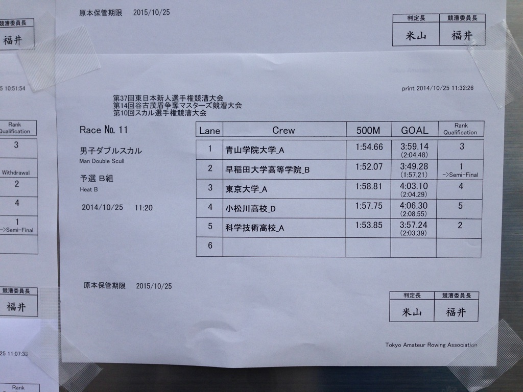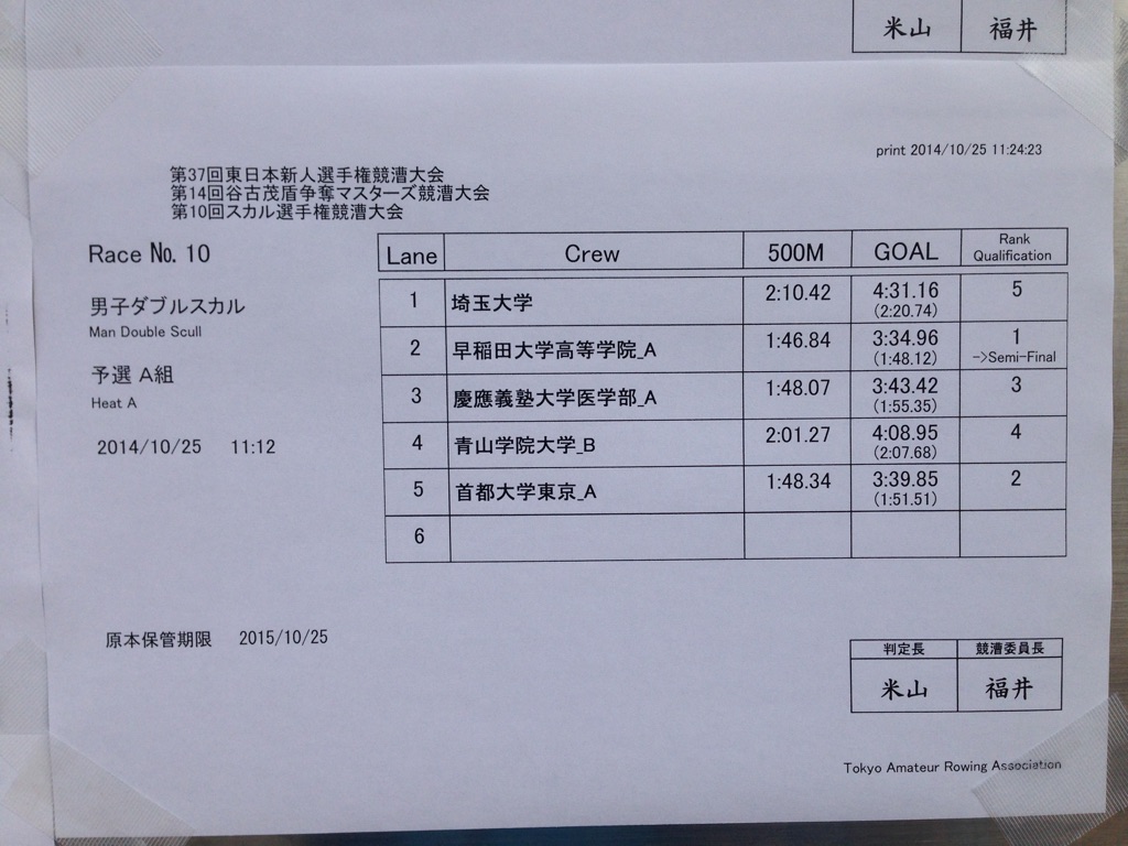 第37回東日本新人選手権大会結果(初日)の報告 本日、第37回東日本新人選手権大会(初日)が戸田ボートコースにて開催されました。 当部からは男子2×の2艇が出漕し、結果は残念ながら予選敗退となりました。 青山学院大学A(玉虫・坂田)予選B組3位(全体14番目タイム) 青山学院大学B(遠藤・深野)予選A組4位(全体19番目タイム) 明日は順位決定戦C、Dへ回りますので、組み合わせを参照の上、 お時間のある方は是非ご参加ください。 « 第37回東日本新人選手権大会出漕のお知らせ 第37回東日本新人選手権大会結果(二日目)の報告 »